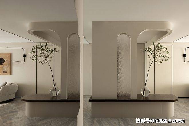 挑高扇形弧度造型、内置收纳玄关柜,与自然质感的材质虚实结合,绿植与灯光的适度渲染。