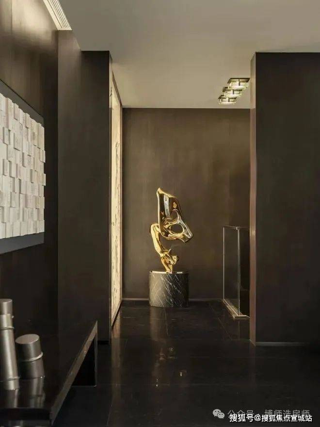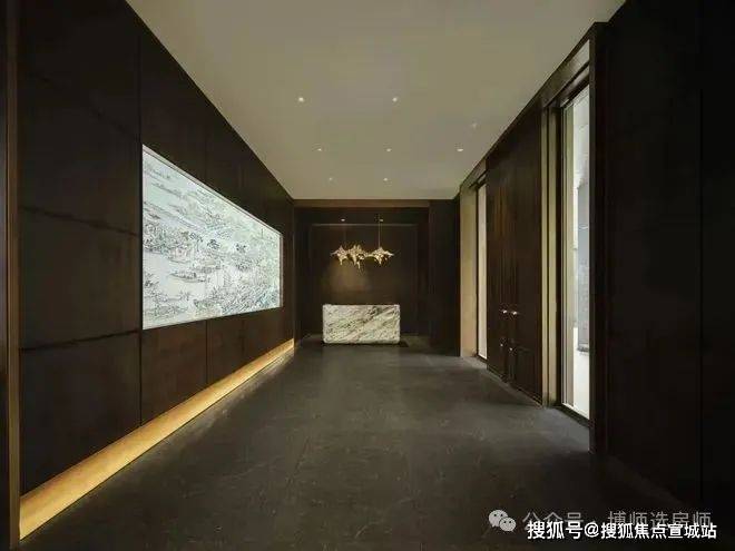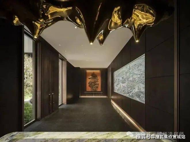 利用现代科技LED艺术装置背景,作为可变空间元素,将江南园林及苏州在地性文化融入其中,并随时变换。墙面通过深色木化作中式花窗格。大门采用厚铜门,表现出江南大宅的门厅感受,迎接客人到来。