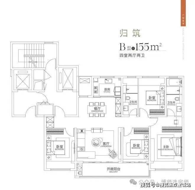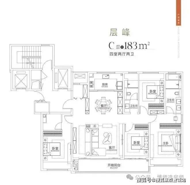 183户型为2梯2户设计,做了4房2厅3卫,含2个套房。户型方正,没有空间浪费;四开间朝南,南向面宽达16.3米,客厅开间6米,阳台宽9米;入户有玄关,预留了家政间空间;餐厨区南北向连,与客厅保持恰当的距离;主卧套房面积约32.6㎡,卫生间含双台盆、淋浴和浴缸;次卧套房面积也不小,但是为暗卫。