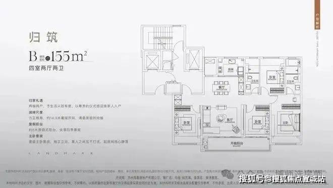 155户型也是2梯2户设计,做了4房2厅2卫。户型格局与183户型差别不大,相当于是缩小版。南向面宽14.9米,客厅开间5米,阳台宽8米。