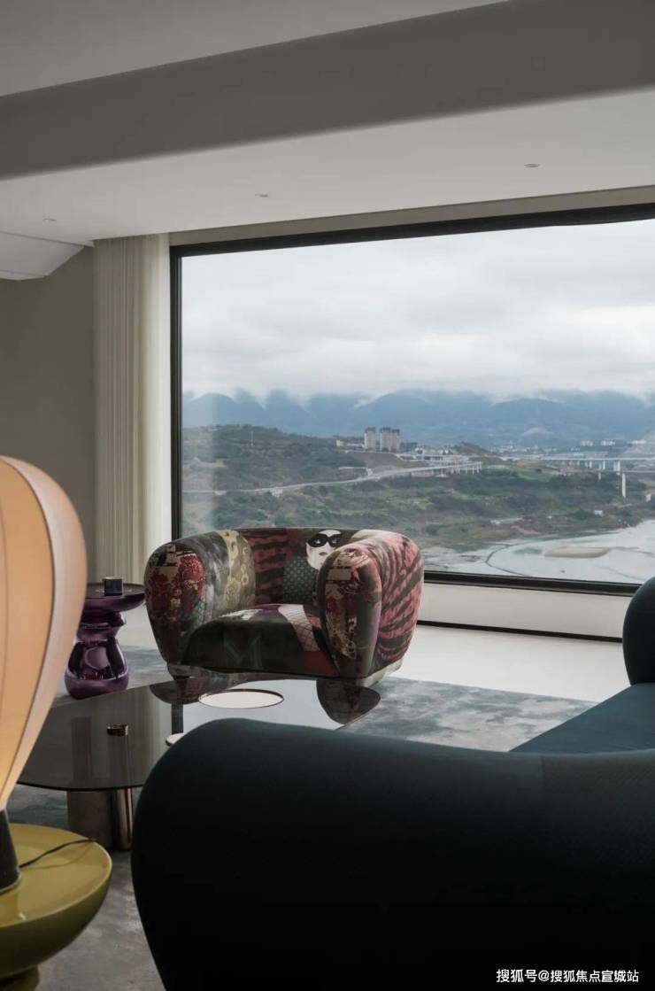 客厅面的玻璃正对处,是一整面干净的背景墙,它仿佛成为了窗外变幻的景色的幕布,点亮空间的诗意。