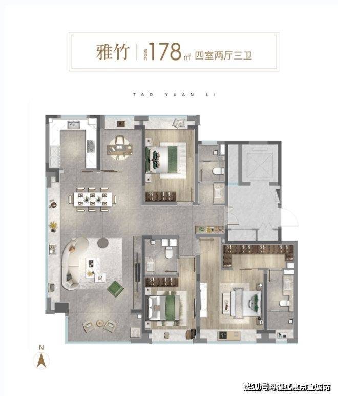 通过新桃源会客厅社区广场与独立社区会客大堂、林荫归家步道、中央景观聚场、品质入户单元昭示性景墙+专属入户铺装、首层精装大堂五大节点,赋予归家路途更多逸趣与美好。