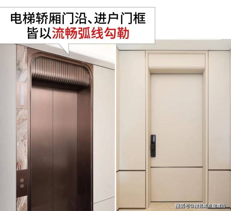 电梯轿厢门沿、进户门框皆以流畅弧线勾勒,为业主日常等电梯和归家增添几分优雅。