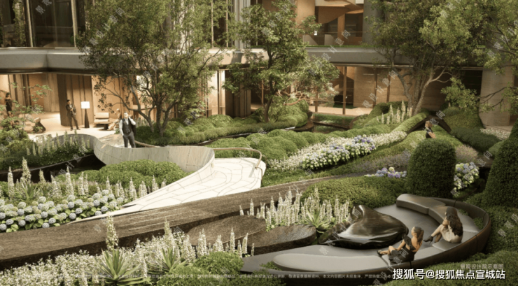 在全域抬板约4米的基础上,项目又下挖,形成罕见垂直落差。依托这一独特地形,项目打造“沿街古树花园+板上浮空花园+板下流石花园”的多层立体景观体系。