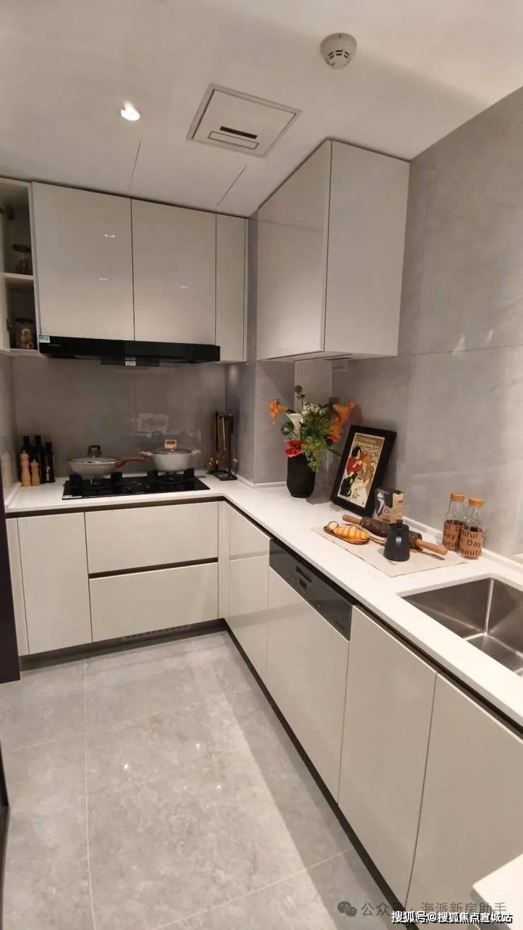 L型厨房,预留了单开门冰箱的位置,飞利浦凉霸,厨具是西门子or博世,洗碗机上了美诺这个级别的。