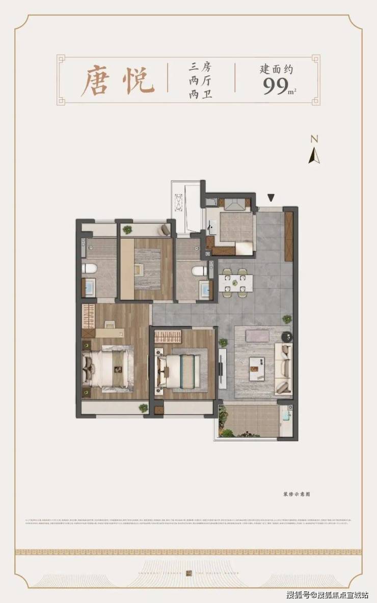 约99㎡3房2卫,汇聚了市面上优秀户型应该有的大多数特质。