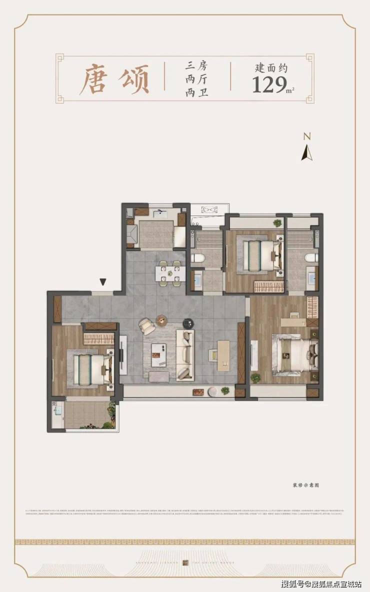 约129㎡做到了市面少有的四开间朝南,配以南向大横厅客厅,社交空间的尺度感在同级中是“奢侈的”。