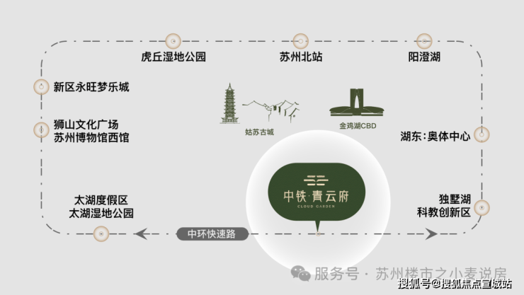 ◎发展之环:中环东接园区产经引擎,西融狮山创新脉络,南承太湖新城生态蓝图,北启高铁枢纽经济,便捷通达苏州多中心,启幕现代化城市发展新篇章。