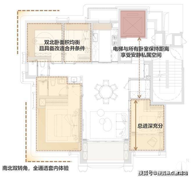 南卧面宽约3米,在设计上远离电梯,可以享受静谧睡眠。