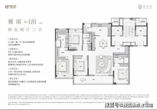 园林方面绿城·沁百合以百合为灵感,打造了“一芯一轴双环”的景观布局,呈现了立体流动的百合花园。