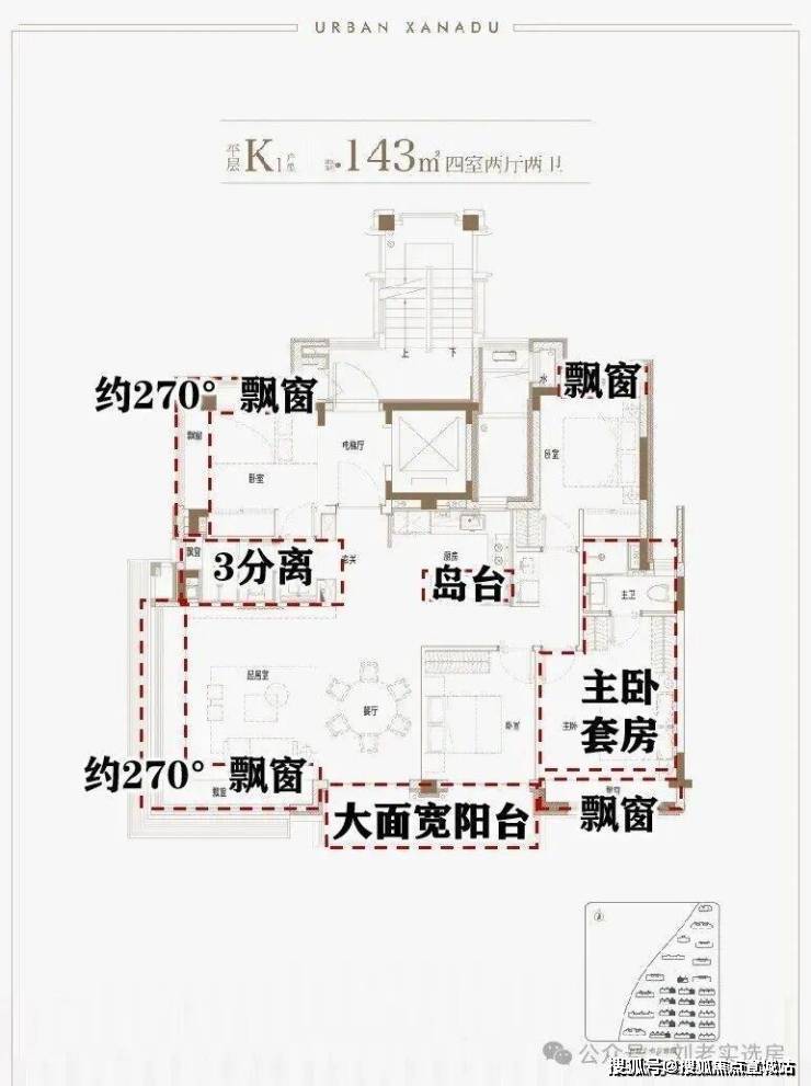户型打造了4个约270°全景飘窗,其中3个卧室和客餐厅都配备了全景飘窗,整体敞亮不压抑。