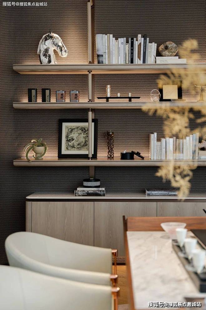 在茶室,设计师选用木美MaxMarko品牌,中式圈椅造型美学辅以天然皮革材质,温润的大理石结合古韵实木,古朴典雅又符合现代美学,在不同材质的碰撞中,探讨当代茶与生活方式的融合。一抹绿意伸展,袅袅烟影落于晴窗,私藏一隅东方雅韵,阅尽书籍的历史厚重感,在茶香与墨香中沉淀生命诗意。
