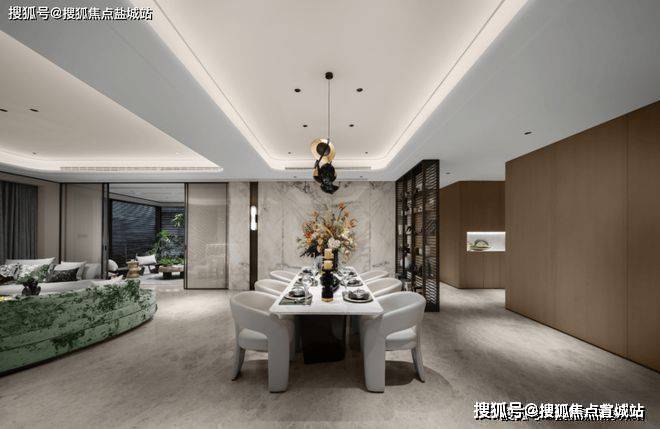 杭州凤咏朝阳售楼处电话☎:400-8828-814(售楼处预约看房热线)餐厅与客厅空间相贯连,开阔的视野带来惬意与更具互动感的用餐氛围。法国餐具品牌Christofle的精巧工艺与大理石水墨画般的自然纹理交相叠映,镜面光泽,熠熠生辉,每一处细节都彰显着对品质生活的极致追求。
