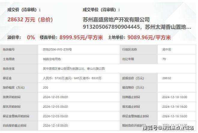 又见江南,即苏地2024-WG-Z36号,位于吴中度假区香山街道孙武路以北、香山北路以西,去年12月,苏州嘉盛房地产开发有限公司、苏州太湖香山置地有限公司以底价28632万元竞得该地块,成交楼面价9000元/平。