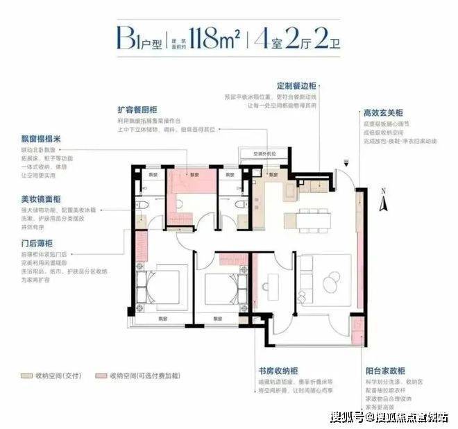 97㎡三房:非承重墙设计,北向两房可合并,三开间朝南,餐客横厅连接1.8米进深阳台