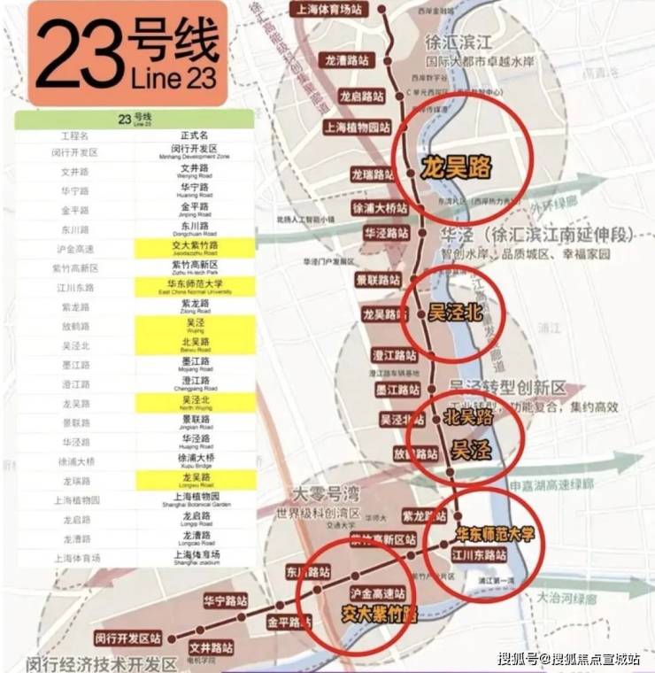 在建中的23号线作为上海西南重要的交通主干道,起于闵行开发区站,终于徐汇上海体育场站,一期线路共设车站22个,其中9个位于吴泾,沿途可与3、4、5、12、15等多条轨交换乘,预计将于2027年底试运营通车。