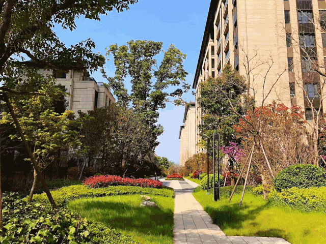 小区的景观,两侧的灌木和乔木交错生长着,绿意盎然。
