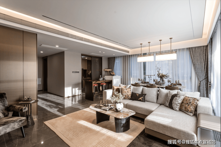 这个岛台,下厨藏着一份乐趣:你切菜来我烹饪,美食上桌,笑语盈盈。客人来了,或茶或红酒小酌,聊聊商务合作,氛围轻松,聊得畅快。