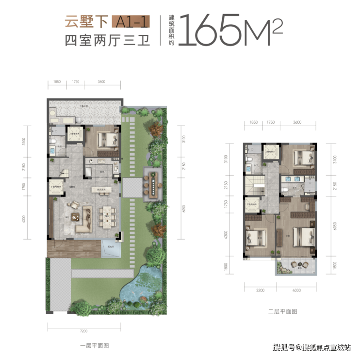 户型亮点:下叠有 60-100㎡私家庭院 + 下沉式花园,L 型客餐厅 7.2 米面宽,独立老人房设计;上叠有 80㎡星空露台 + 北向私家花园,电梯独立入户,屋顶瞰景空间。