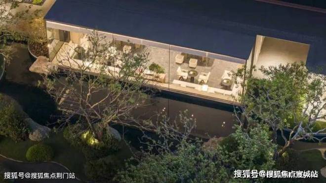 从约80米长的主入口展开,先是约1500方下沉式庭院会所,再是风雨连廊连接大面玻璃的景观架构,再向里又是大片的水系和景观绿地。