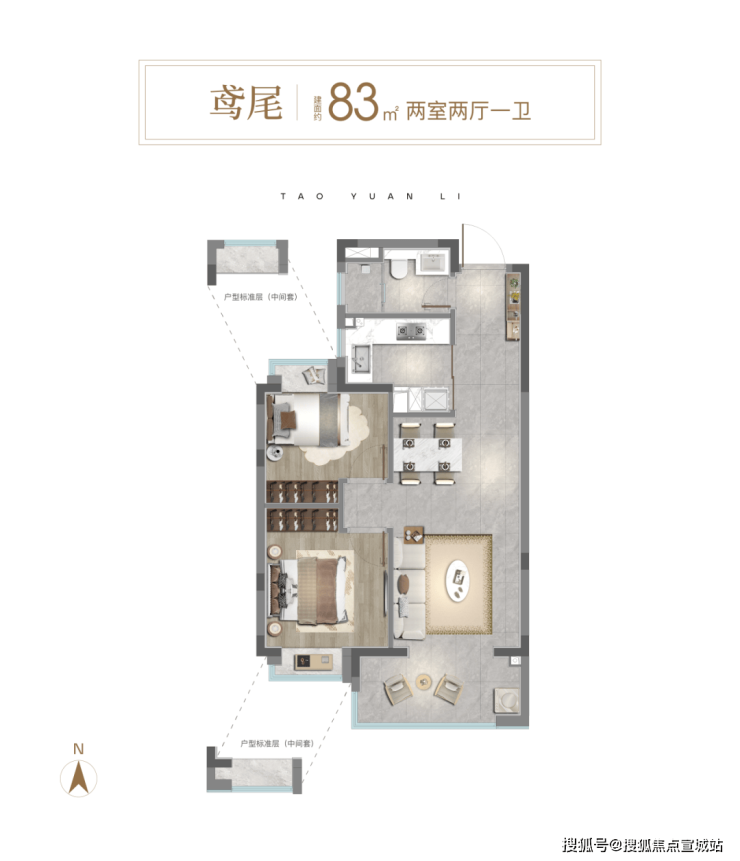 建面约83㎡两房户型▼