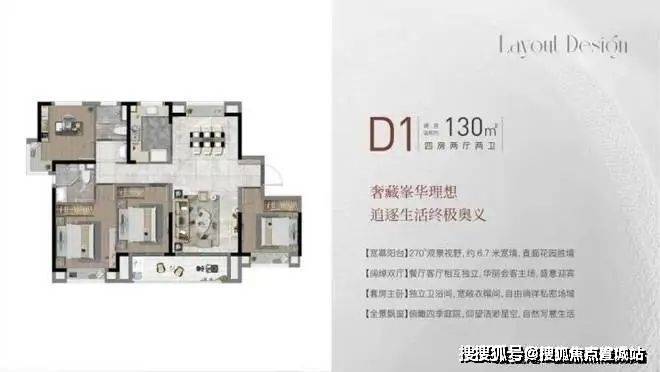 建面约130㎡4房2厅2卫,做到了四开间朝南+南北通透+主卧套房设计+双阳台设计+卫生间干湿分离,“一步到位”大4房,空间尺度非凡。