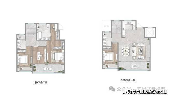 叠墅:上叠约 160㎡四房两厅三卫,带约 60㎡露台;下叠约 180㎡四房两厅三卫,带 40-100㎡庭院,一梯两户设计。