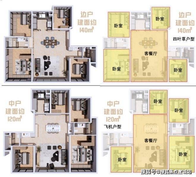 壹江臻邸首开的两个户型精准运用“四叶草”与“飞机”两种经典户型布局,将卧室巧妙分散于四角,从而将开阔方正的客餐厅置于户型中心,奠定了高效的空间格局。