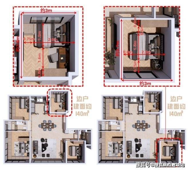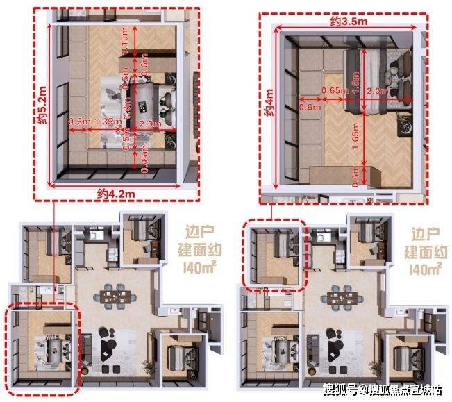 南向主卧轴线面宽约3.6m,南向次卧轴线面宽约3m,并且享有与140户型相近的进深尺度;北侧两个次卧轴线面宽分别约2.6m与2.8m,结合附赠的飘窗,亦可完美容纳“单人床+书桌+衣柜”的配置。