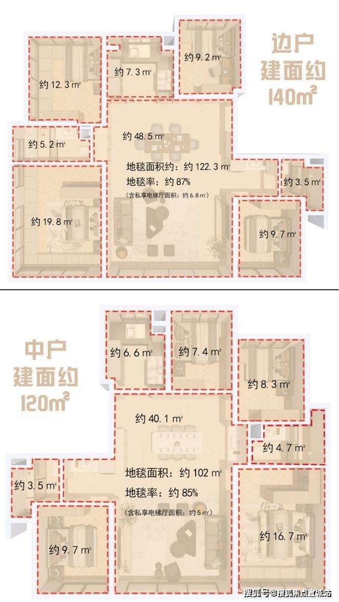 加上全屋满飘窗和阳台的赠送——建面约120㎡户型地毯率约85%;建面约140㎡户型的地毯率更是高达约87%,在当下市场中,地毯率能够到达80%以上的产品已经是佼佼者了,而壹江臻邸项目首开两个户型的地毯率双双突破了85%,实属难得。