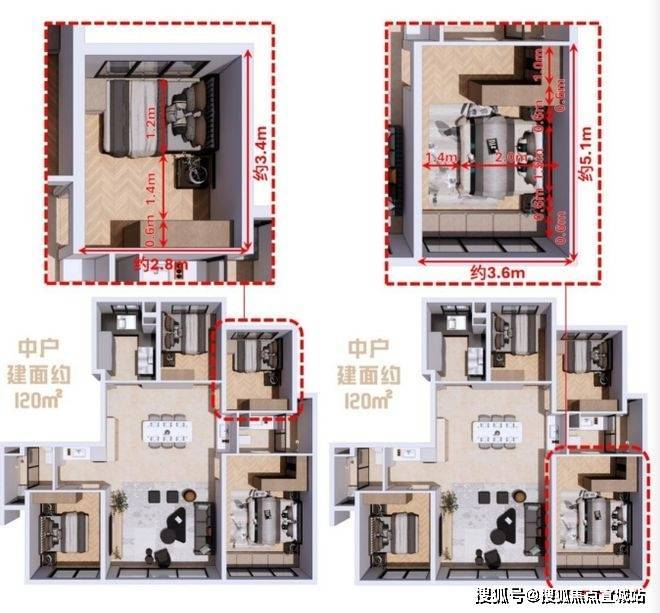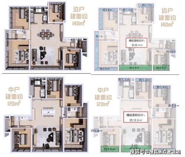 §建面约120㎡的产品,通过6个飘窗、2个南向阳台(赠送一半面积),赠送约13.5㎡,加上私享约5㎡的电梯厅,整体赠送面积约18.5㎡;