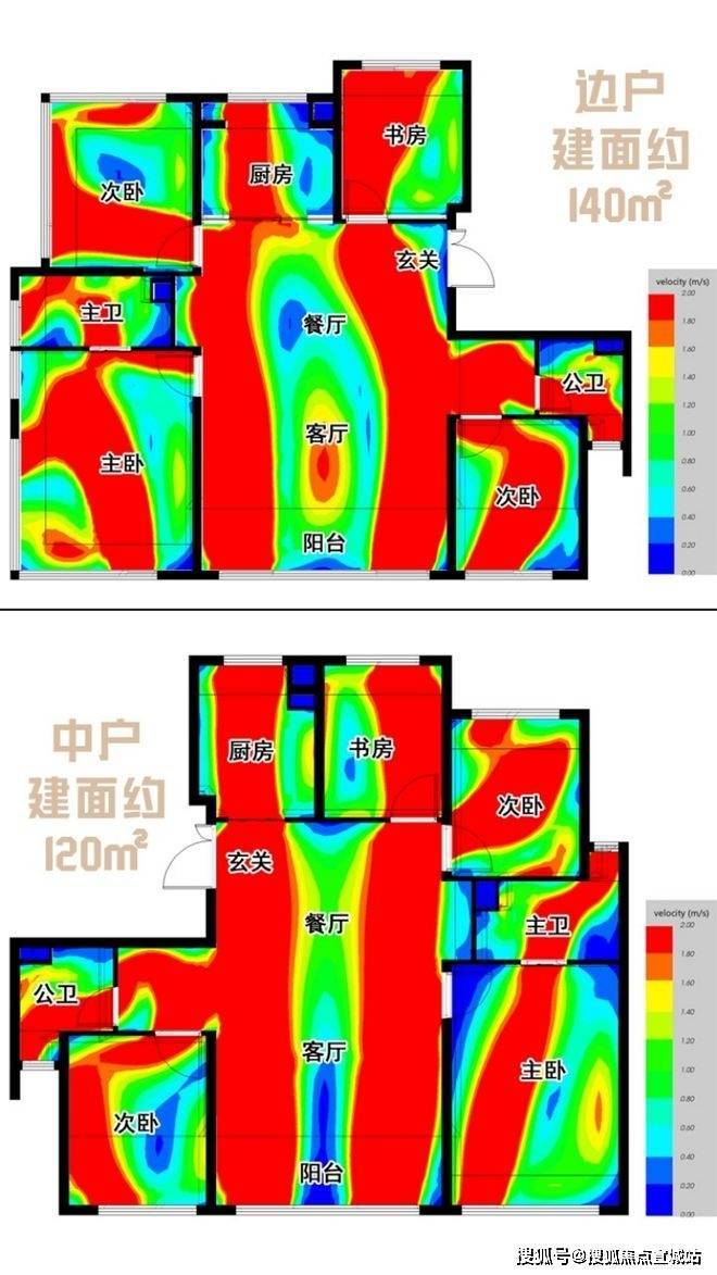 图上模拟计算的是在春夏季东南风环境下,户内的通风情况。颜色代表风速,红色最优,蓝色基本静止;箭头代表流动方向。从中可以看到,大部分房间都有最大风速的红色箭头,表示在开窗情况下,这些房间都有优秀的通风条件。