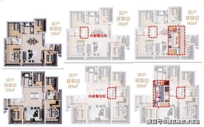 §建面约140㎡的产品,更是通过6个飘窗(含2个转角飘窗)、2个南向阳台(赠送一半面积),赠送约20.4㎡,加上私享约6.8㎡的电梯厅,整体赠送面积高达约27.2㎡。