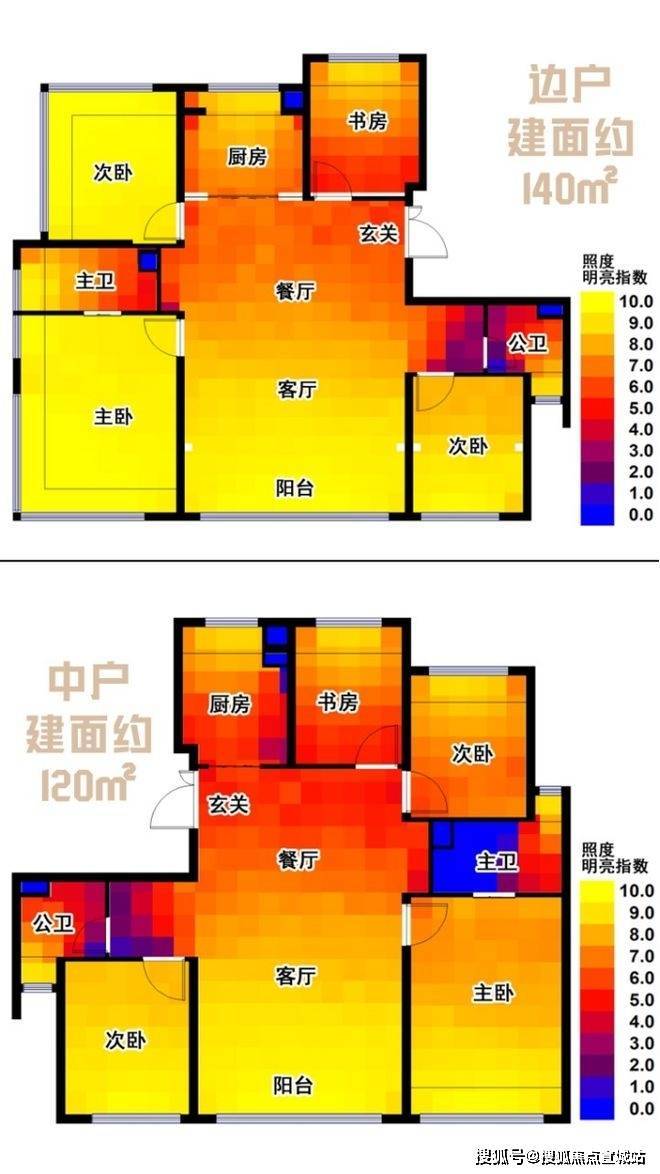 上图为两个户型的采光模拟计算,黄色橙色代表最明亮的地方,所有主要房间基本上都被覆盖。