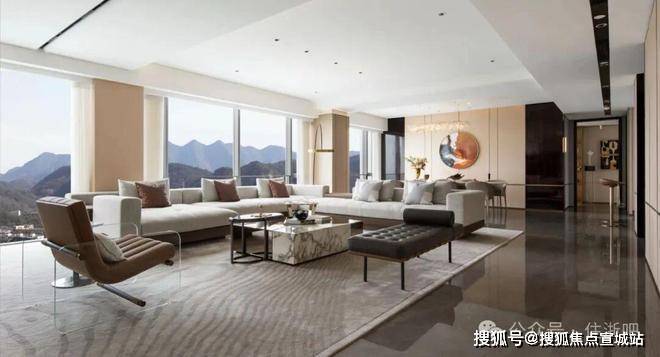 约24米南向瞰景面宽、约100㎡LDK社交型厅堂、约50㎡奢华主套房以及270°L型观景采光面,营造大气通透的格局感,彰显出空间的奢阔尺度,以此匹配峯层的壮阔气度。