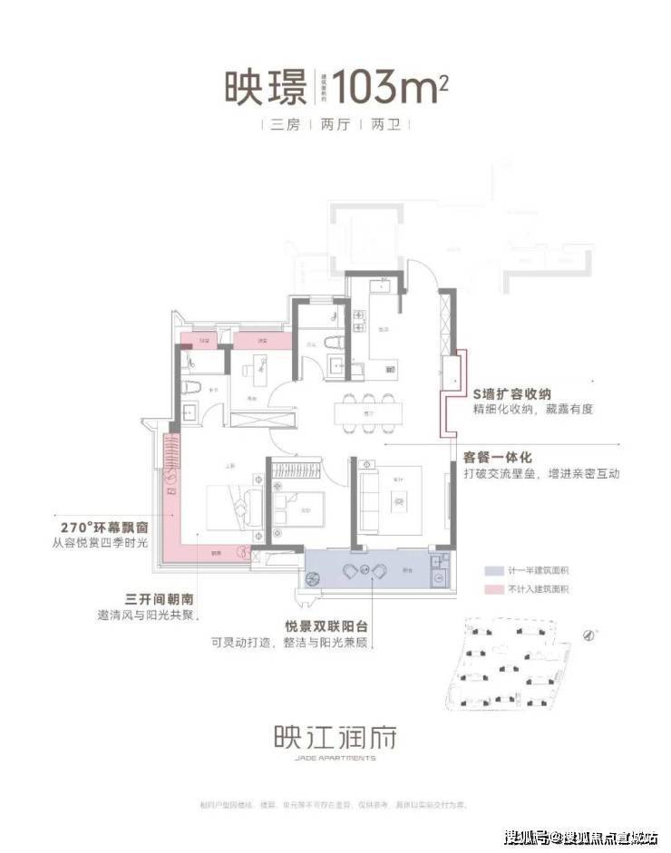 建筑面积约103㎡三房两厅两卫,不失为改善家庭的首选。其中边套户型,映江润府的主卧套房做了270°环幕飘窗,实现无与伦比的采光通风和视野享受,类比于千万级豪宅的体验!