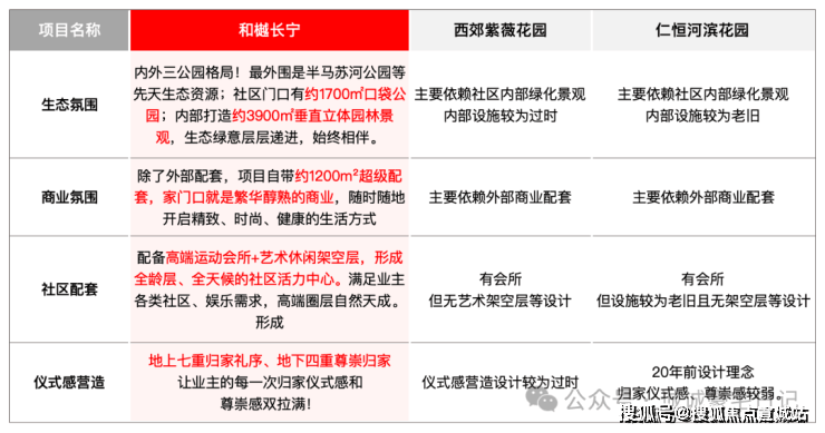 和樾长宁的迭代首先是公区发力,我们可以对比下同板块3个关注度较高小区:和樾长宁、西郊紫薇花园、仁恒河滨花园(最新挂牌价也有12万+)的公区配置。