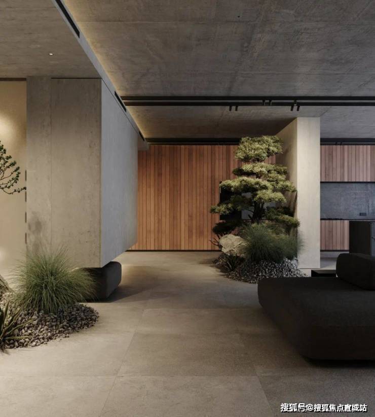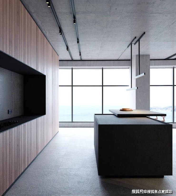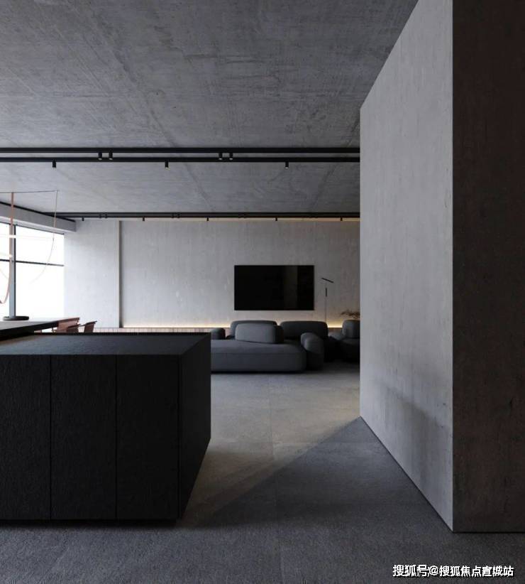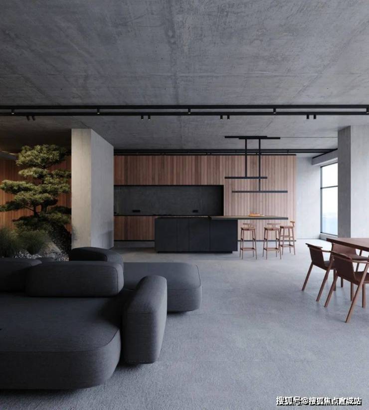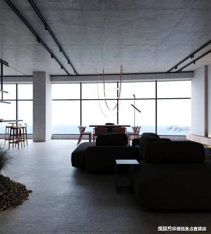 天花板以裸露的方式呈现,给室内增添了几分朴实的工业化美学。大面积的落地窗造就了室内良好的光线环境,让整体灰色系的空间看起来并不那个阴暗。