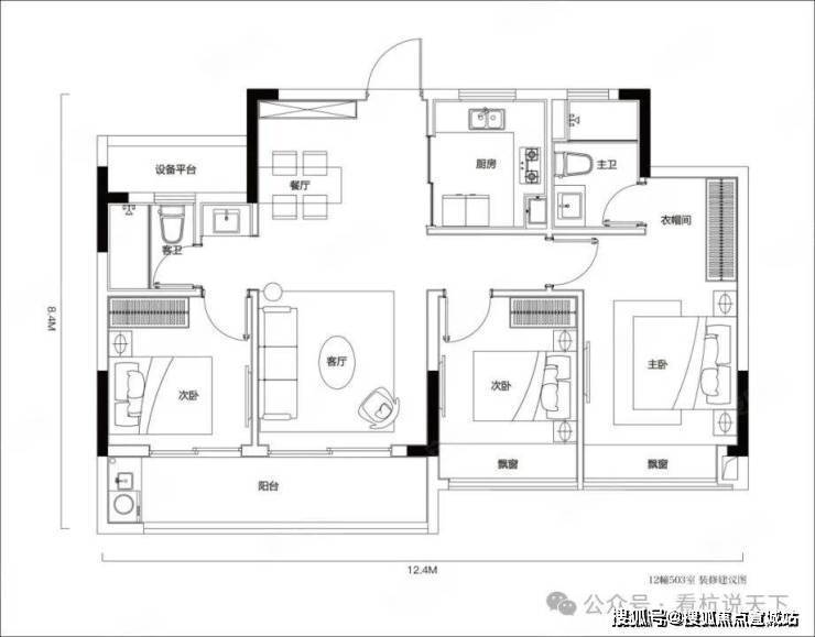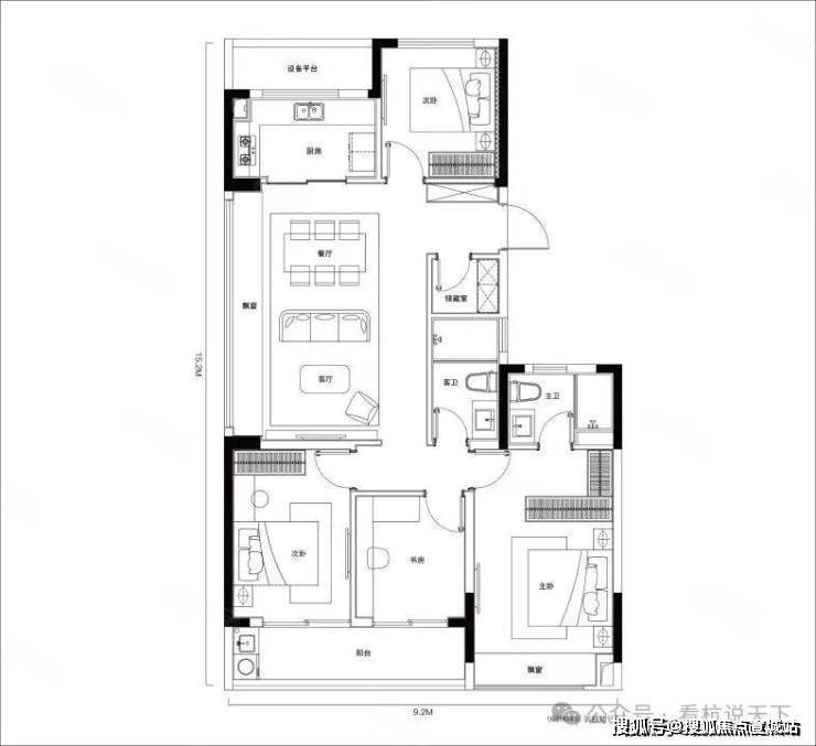 以湖与舍建筑面积约100m的中间套为例,面宽超12米,四开间朝南,客厅和三个卧室都朝南,客卧双联阳台、双飘窗,采光相当优越。不止是主套房设计,它甚至做到了大阳台、双飘窗、面宽超12米的四开间朝南!卧室、书房均向阳,中间套户型私密性欠佳的顽疾丝毫没有体现。