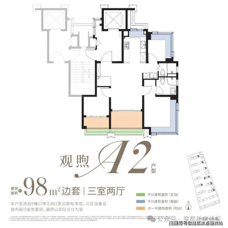 约98㎡3房:类一梯一户、全屋飘窗为标配,双阳台+花池是核心亮点(市面双阳台户型起步多为约110㎡),整体附赠约23㎡,是罕见的高实得率精致户型。