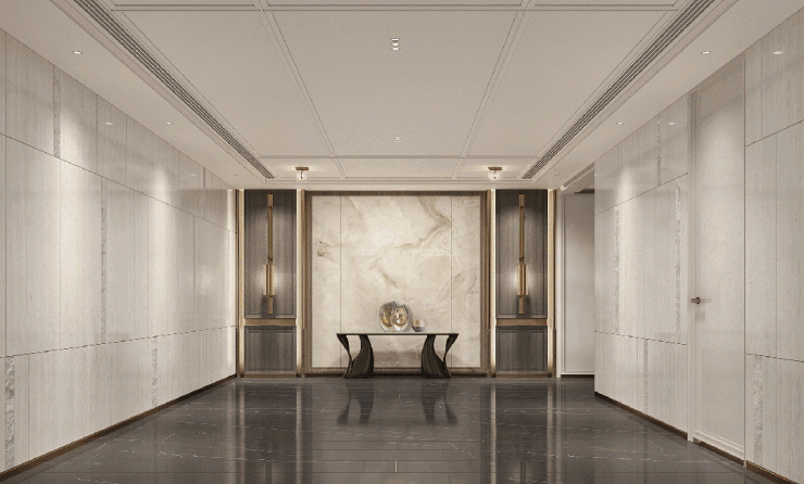 露香园天誉售楼处电话:400-8618-004厅堂右墙上放置一幅超大尺度的以石库门砖墙为元素的肌理挂画《城市的记忆》,在展厅的厅堂空间,设计师则摆放着一座极具雕塑感的法国ARTDECO羊皮纸拂面工艺所制作的圆桌,左侧的走廊选用艺术家高级定制的瓷片水墨装置,呈现露香园四宝“顾振海墨”的人文气息,展现出露香园独特的、高级的美学品位。