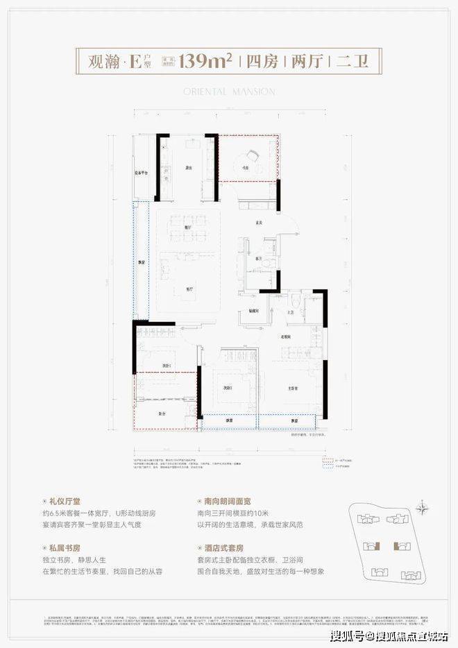 除了适合初改家庭的三房户型外,鸣澜里139平户型同样做的不错,打造四房两厅两卫,分为横竖两款,全部为边套,两梯两户设计。