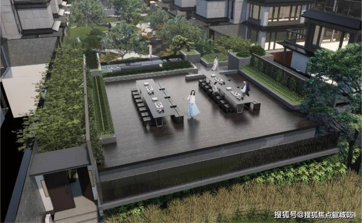 利用高差设置观景平台,为业主提供停留、休憩、赏景的场域,近可俯瞰园区内曼妙风景,稍远处可眺望运河风光。也可在此品茶、听音乐,如同再现宋徽宗赵佶《画唐十八学士图》的优雅场景。