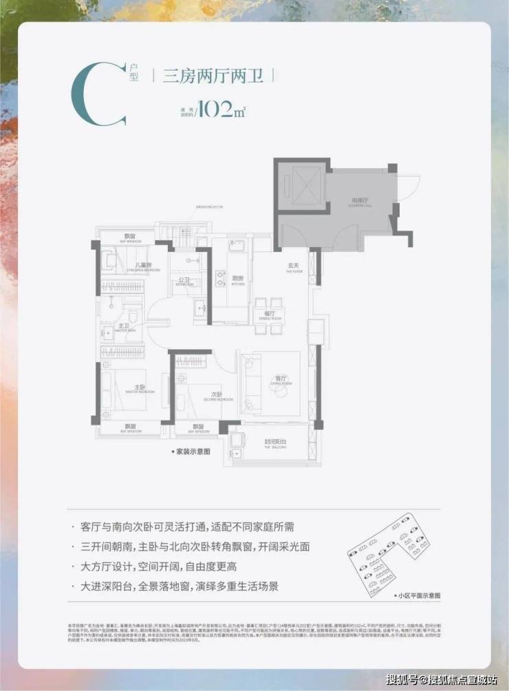 在同步继承百平户型优势的基础上,针对小户型空间有限的客观现实,做出了对应的设计。三分离卫生间,不仅将“一卫”的空间还给了其它房间,更可容纳一家三口分别使用不同功能区,增加空间利用率。三卧室带飘窗,提升使用面积。