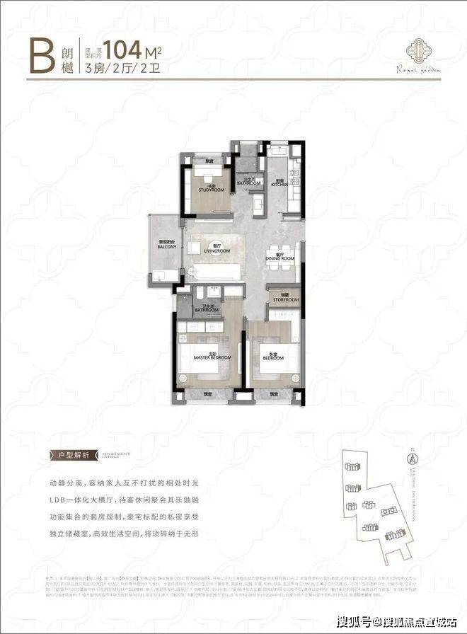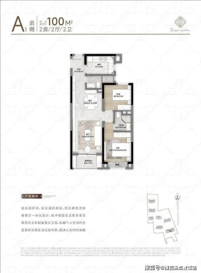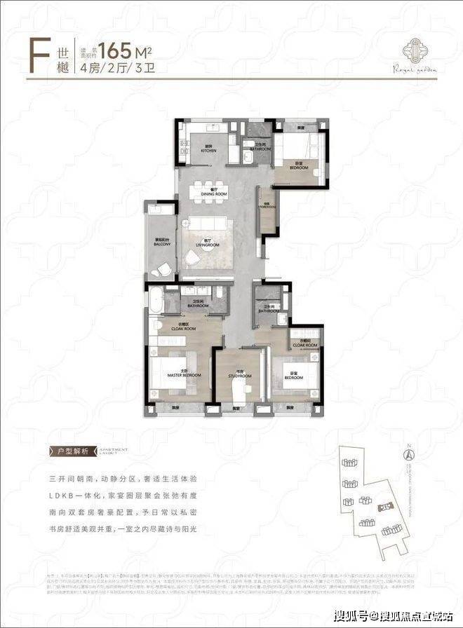 户型特色:采用大面宽、短进深设计,生活区全朝南,动静分离,全套房配置,部分户型享 270 度景观视野。