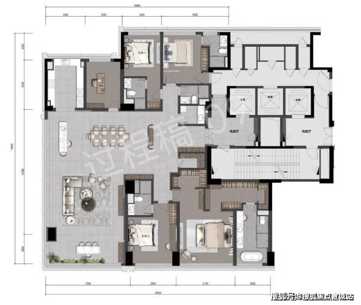 公区方厅第一眼的感觉就是辽阔,建筑面积超90㎡,想举办超大型party都没问题,并且南向开间有约19米,这样的尺度能和市面上四五百方户型的客厅媲美了。