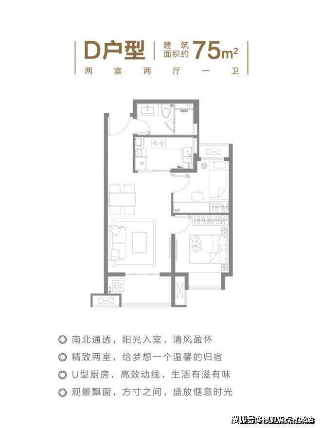 建面约75㎡2房户型,是目前少有的能以超低总价上车的户型。并且,双开间朝南+主卧带飘窗、客厅带宽面阳台的设计,保证了室内每个空间都能享受到惬意的阳光。