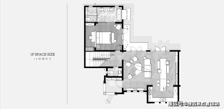在这套别墅一楼,包含有会客厅、餐厅、开放式的厨房以及一间套房设计的卧室,然而这还只是这套90平米院墅的一楼部分。
