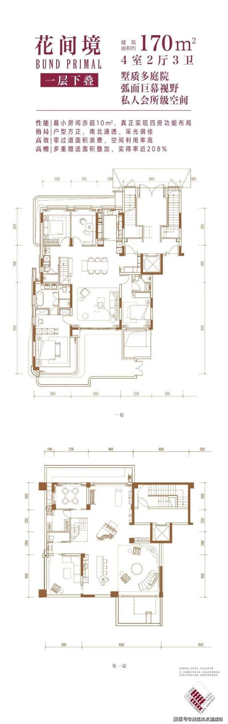 建面约169㎡4房2厅3卫(一层下叠):