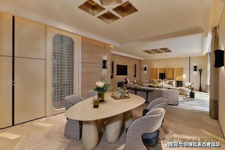 这一层更聚焦于私谈、影音、娱乐、品酒、饮茶,深沉又静谧。近6米高的垂直挑空玻璃壁炉矗立于眼前,如同一件令人赞叹不已的大型雕塑装置,它弱化了空间中的大理石承重柱,将其纳入共同构成一个完整的全新的装置,集功能性与艺术性于一身。